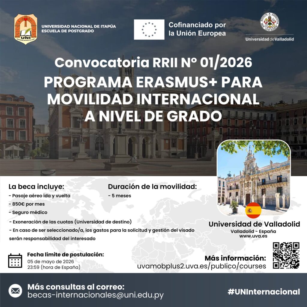 20 de abril de 2026 2026-04-20 20:45Convocatoria RRII N° 01/2026 para el Programa Erasmus+ en la Universidad de Valladolid – España 🇪🇸